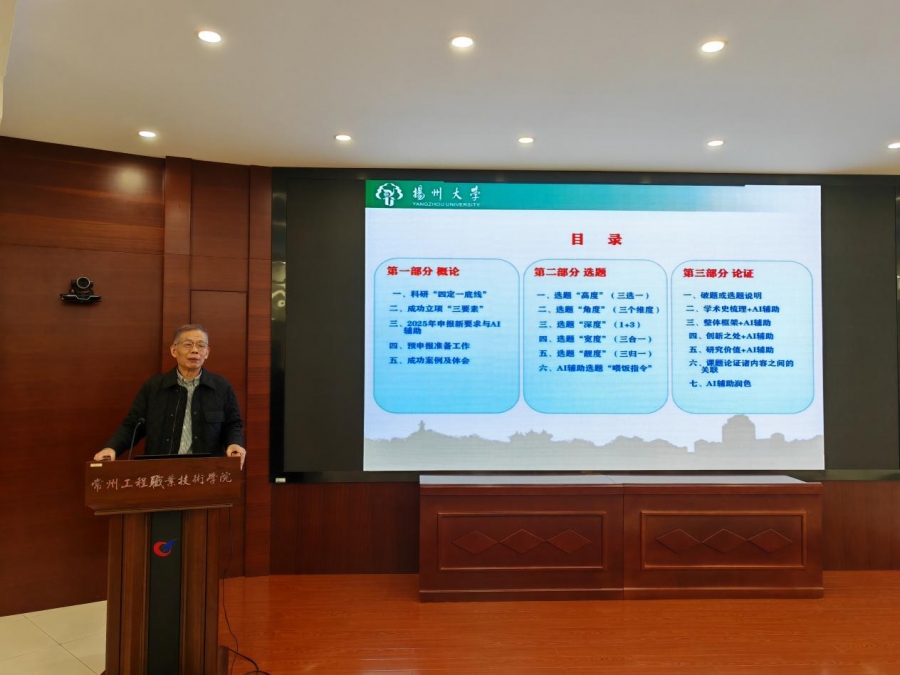 本次会议特别邀请扬州大学二级教授、博士生导师秦兴方教授作专题辅导。秦教授在国家级社科项目申报与评审方面拥有深厚的理论功底和丰富的实践经验。报告中,秦教授以“知行合一”为框架,系统阐述了成功申报教育部人文社科项目的核心路径。他提出要坚守“四定一流线”的科研准则,牢牢把握“有基础、选题佳、有特色”三大立项要素,并深入讲解了选题凝练的“五度”模型——高度、靓度、角度、深度、宽度,以及如何完成逻辑严密、内容扎实的课题论证。他特别强调AI技术辅助选题凝练、文献梳理与论证深化的重要作用。秦教授的辅导内容高屋建瓴又贴近实际,既有理论高度又有实践操作性,为与会教师廓清思路、指明方向。